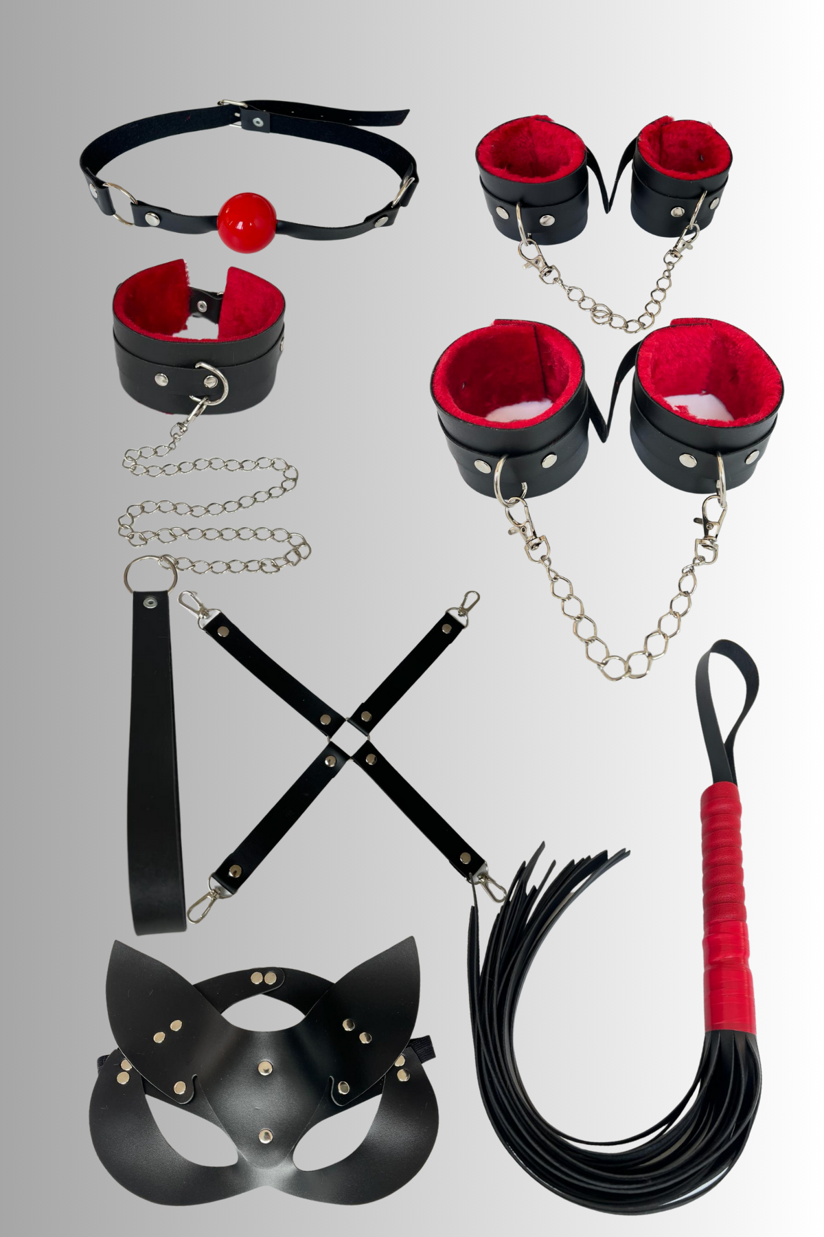 Anastasia 7'Li Harness Kırmızı Fantezi Kelepçe Kırbaç Tasma Içi Tüğlü Aksesuar Seti 700215